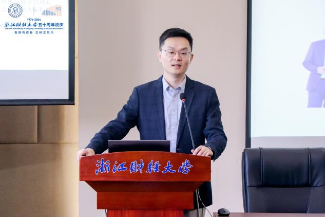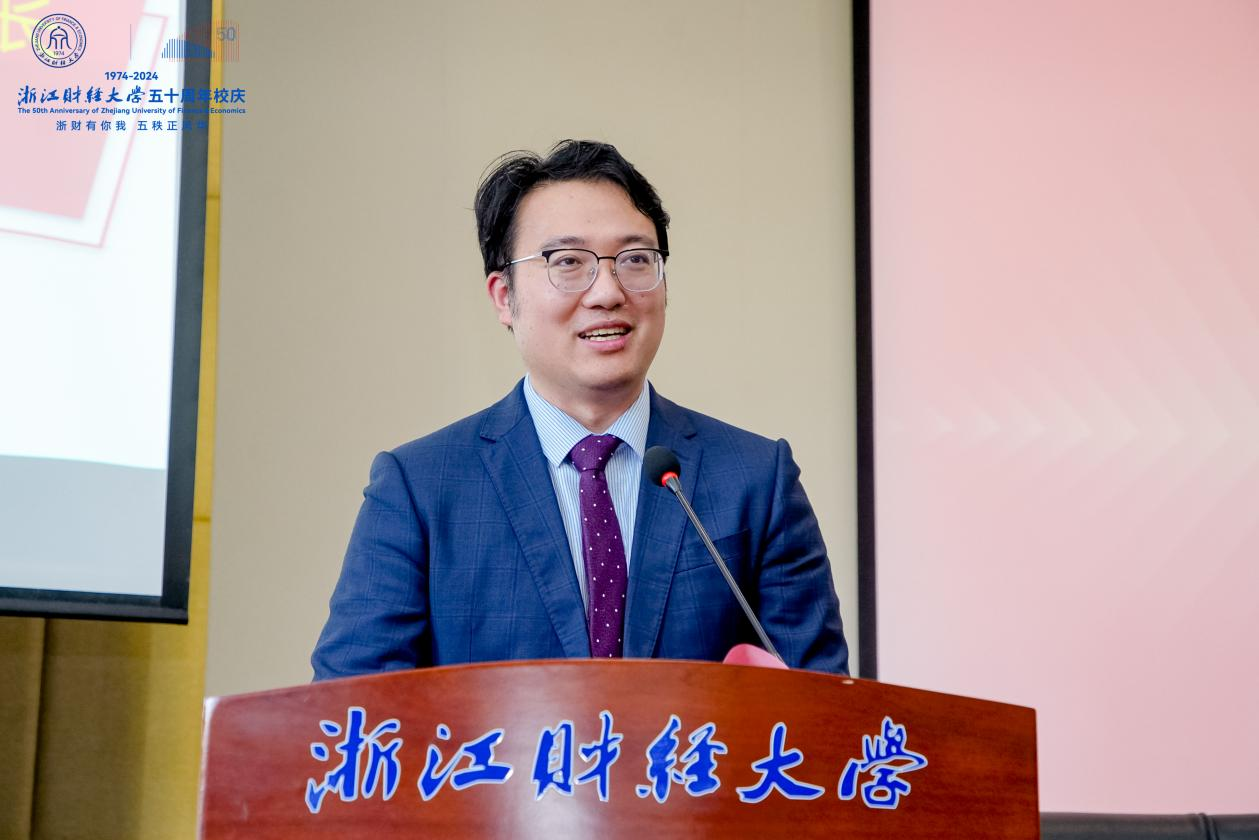 接着,浙江盈阳资产管理有限公司董事、副总经理陈智杰讲话。他提到,“盈阳金融突出贡献奖”设立的初心是激励教师提高课程教学质量、提升科研与社会建设水平。在广大师生校友的关切和支持下,学院学科专业建设已取得显著突破,育人体系搭建已取得傲人成绩。他衷心祝愿学院和学校越办越好,为社会输送更多顺应时代发展、适应市场变化的综合型金融人才。